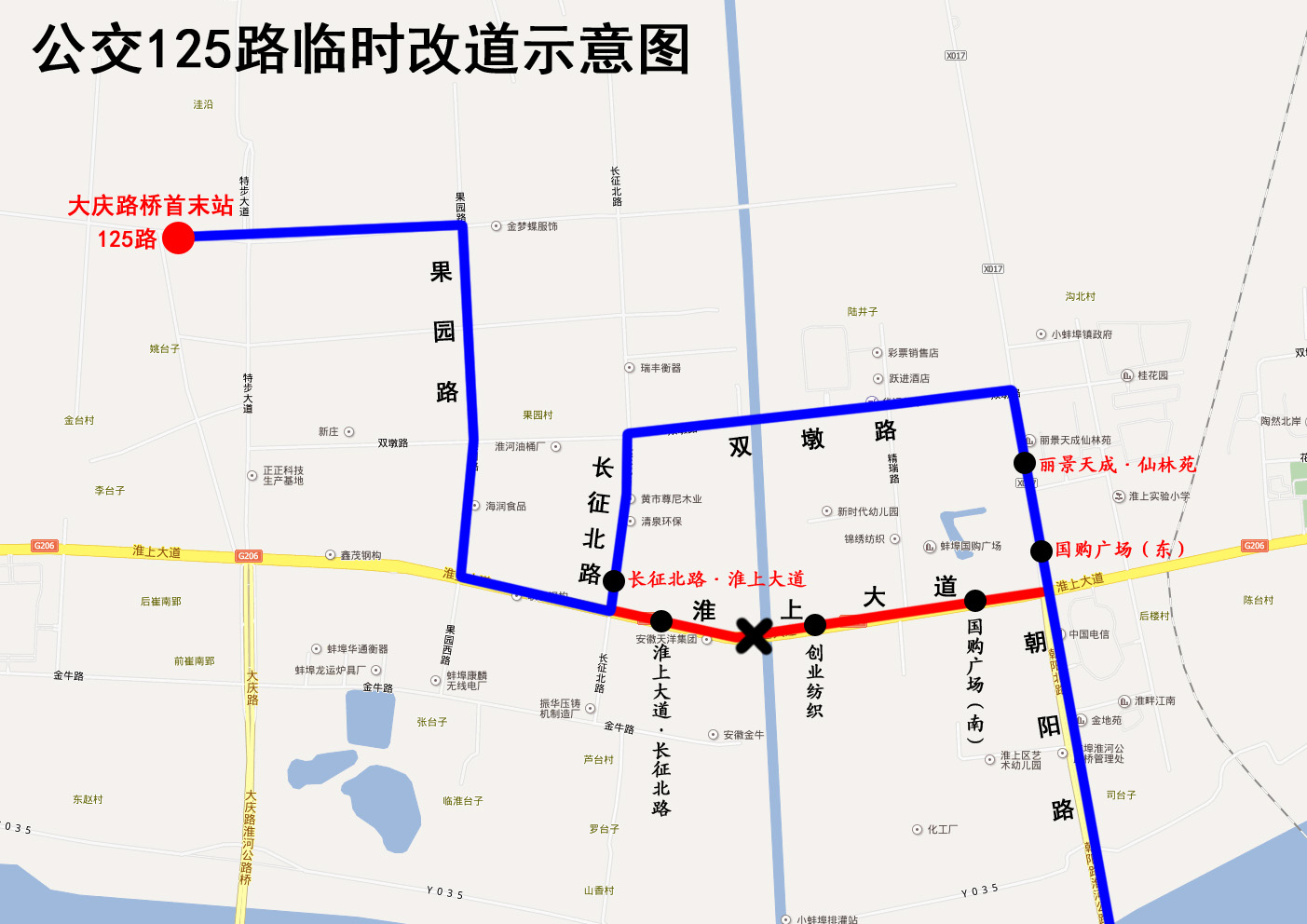 因淮上大道(朝陽(yáng)路—長(zhǎng)征北路)路段路面破損嚴(yán)重,已無(wú)法滿足公交車通行條件。2019年4月25日起,公交125路來(lái)回雙向改道為:原線路—淮上大道—果園路—原線路調(diào)整為原線路—朝陽(yáng)路—雙墩路—長(zhǎng)征北路—淮上大道—果園路—原線路。