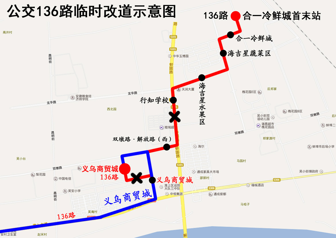 因合一冷鮮城首末站盛中路、豐安路封閉施工,2019年5月16日起,公交136路由原合一冷鮮城首末站調整至義烏商貿城首末站。