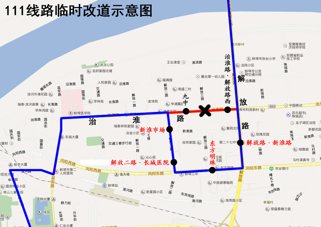 111路公交車臨時改道公告 因治淮路(解放三路至解放路)封閉施工,2019年7月20日起,公交111路來回雙向改道為:機電技師學院—原線路—治淮路—解放二路—鳳陽路—解放路—原線路—客運北站。 改道期間公交車將取消停靠“九中”、“治淮路•解放路(西)”站。臨時停靠“新淮市場”、“解放二路•長城醫院”、“解放路•新淮路”站。封閉施工結束后恢復原線。