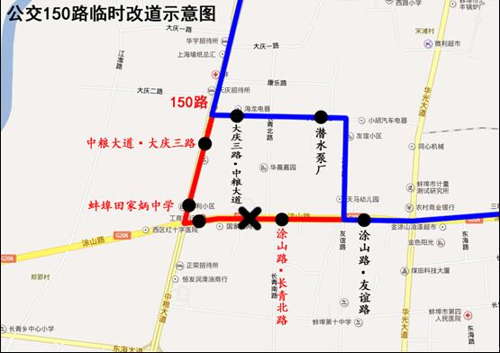 因中糧大道與涂山路交匯路口封閉施工,自3月30日起,公交150線路來回雙向改道為:保稅物流中心—大慶路—大慶三路—友誼路—涂山路—原線路—華海商城。
